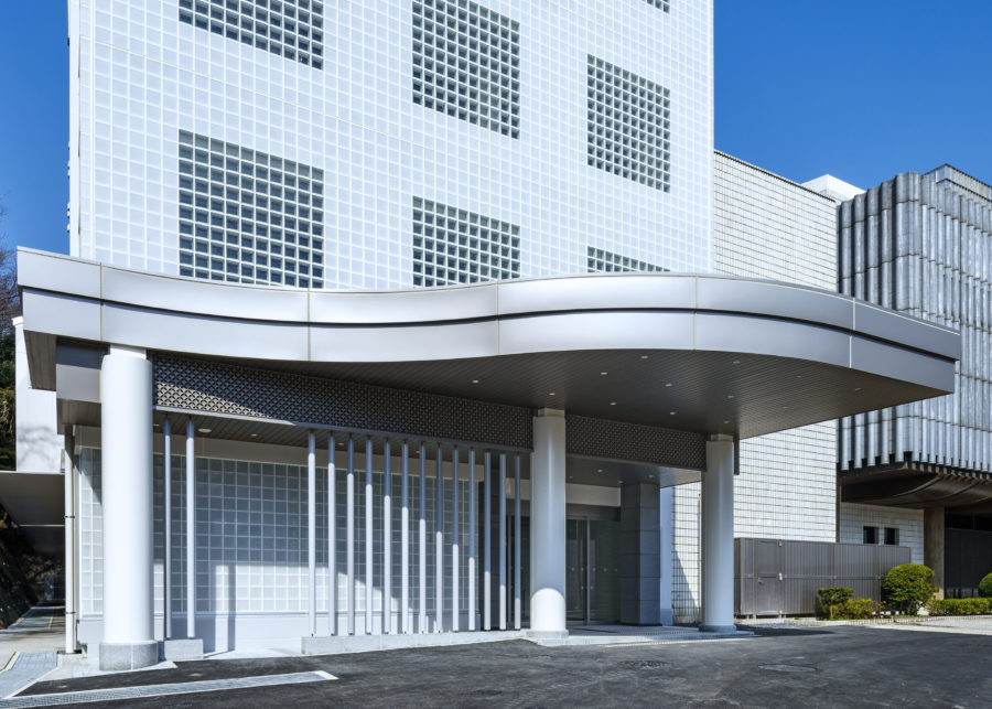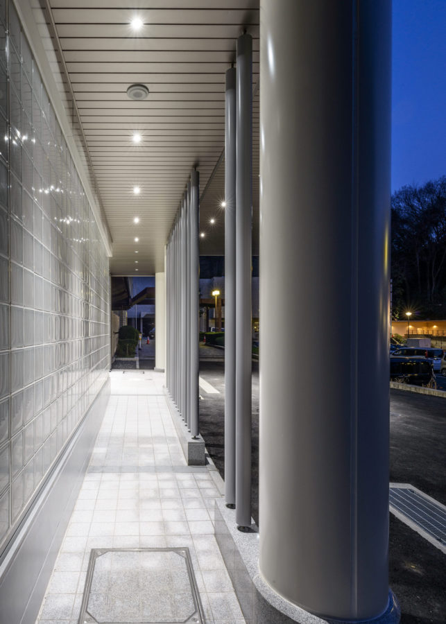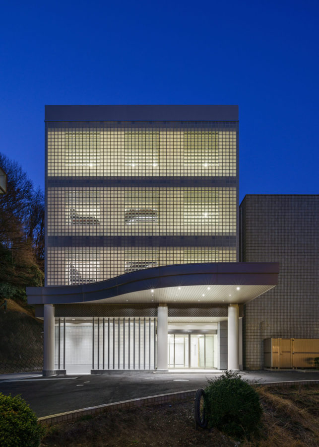 昭和7年に開設した川崎市立葬斎場は、昭和57年に現在の火葬棟・休憩棟、昭和60年3月に斎場棟が竣工した。築後36年が経過した「かわさき北部斎苑」は、施設整備の老朽化・火葬需要の増加・多様な葬儀形態に対応すべく「管理棟」を新たに増築する計画が立案された。斎場は訪れる人が、故人との思い出を偲び、永遠の別れを悲しみ、冥福を祈る場所である。新たな時代に設けられる管理棟の役割として、「やさしさ」と「やすらぎ」のある空間となるような空間づくりを心掛けて計画をしている。外装はガラスブロックのパネルウォール工法を採用し、乳白色と透明の組み合わせで構成し、グリッドによって表された画一的で印象的な外観は、隣接する既存棟のボリュームに寄り添いながら管理棟としての存在感を示している。ガラスブロックの内側では、乳白色のガラスブロックから、やわらかな光を室内に取り入れ、窓状に構成された透明ガラスブロックからぼんやりと外を眺めることができる。式場や収骨を待つ間、故人のことを思い浮かべ懐かしむことができる落ち着いたやさしい空間を作り出している。夜になれば反対に内部の光がガラスブロックを通して外部にこぼれだす。管理棟そのものが行灯のようにやわらかい光放つことで、通夜に訪れる人の心を癒し、やすらぐ存在になることを思い計画した。